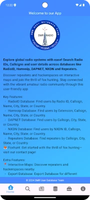 Med DMR User Database App får du adgang til en enestående samling af information, der fletter data fra anerkendte kilder som RadioID, NXDN, Hamvoip, HamshackHotline, Dapnet og Repeaters Database. Appen giver dig mulighed for at finde specifikke DMR-brugere og gentagere gennem avancerede søgefiltre. Uanset om du søger via kaldesignal, Radio ID (Extension), navn eller geografisk placering, leverer appen hurtigt præcise resultater. Det er den ultimative ressource for at udforske den digitale radioverden og finde nye kontakter eller lokale gentagere.